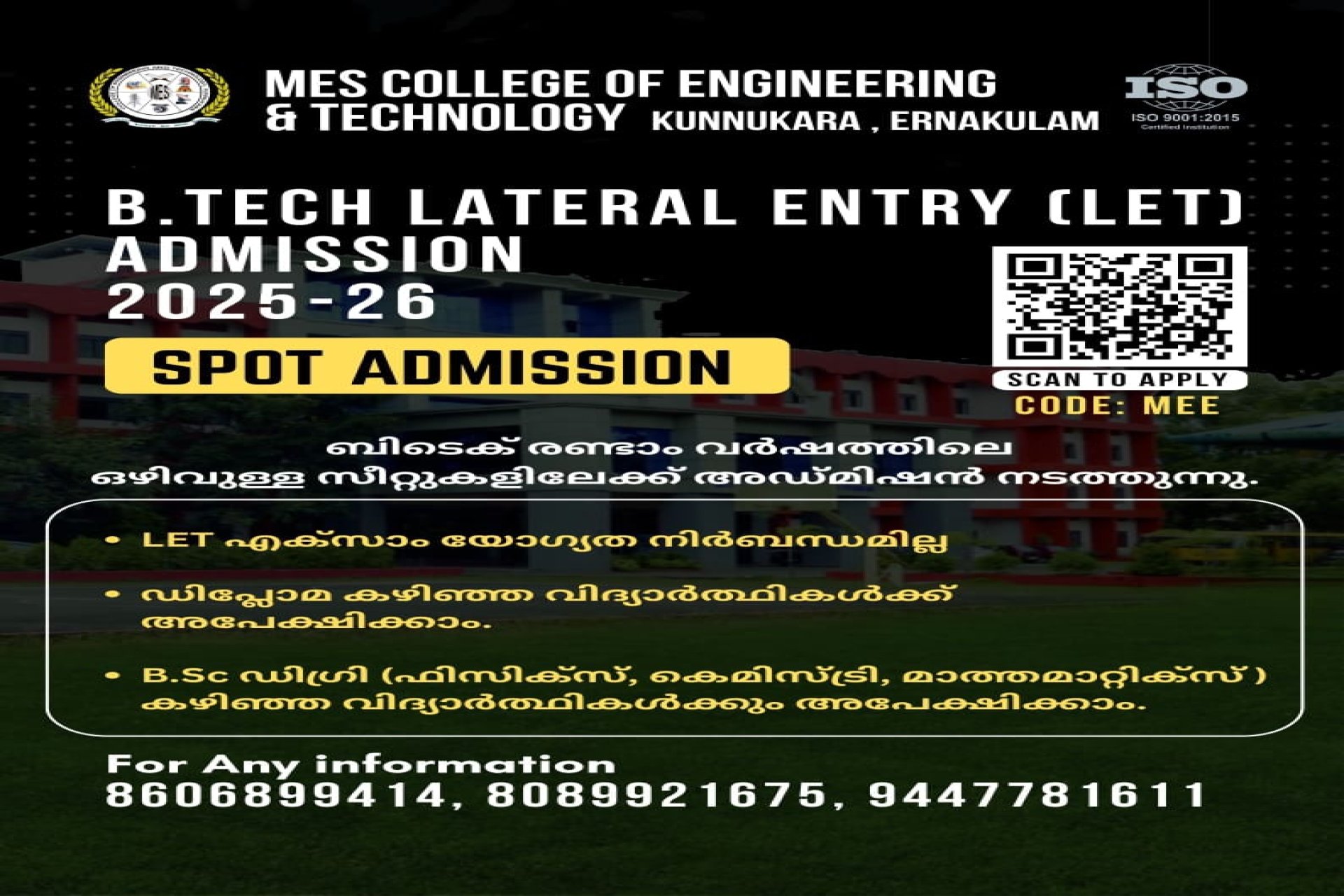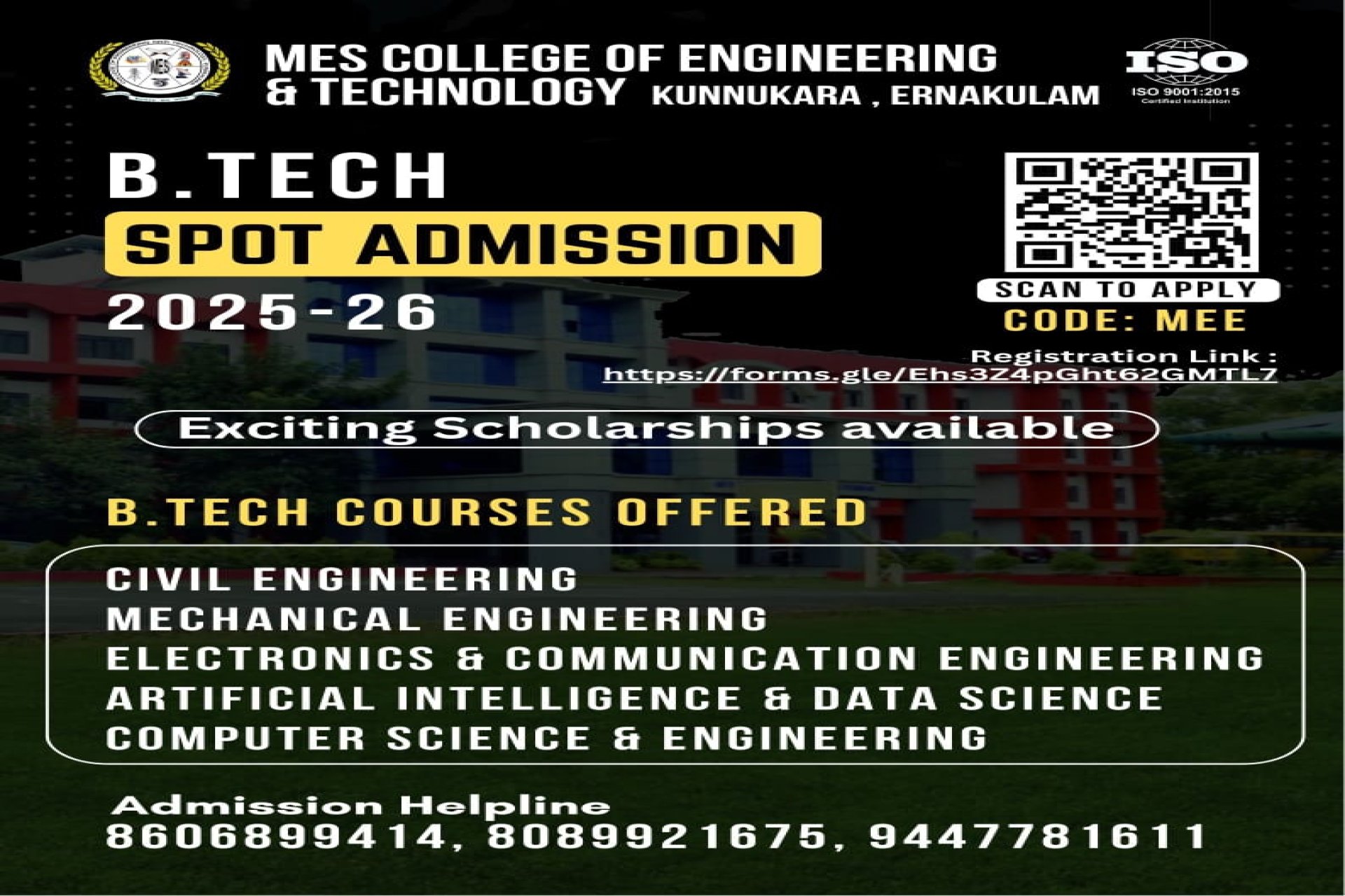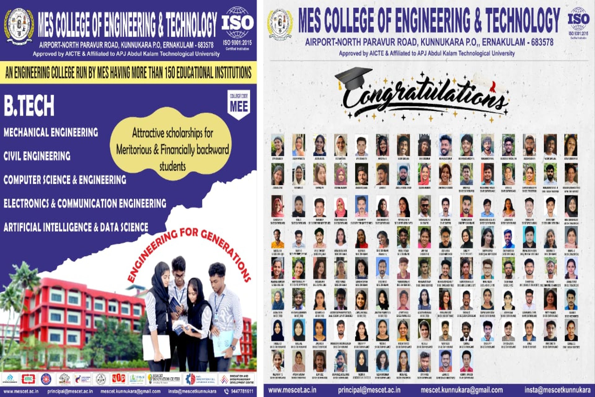 MES College of Engineering And Technology was established in the year 2011 by Muslim Educational Society(Regd). The college is situated on the banks of Periyar river in Kunnukara, North Paravur.The college is approved by AICTE and Govt. of Kerala is affiliated to APJ Abdul Kalam Technological University,Trivandrum.