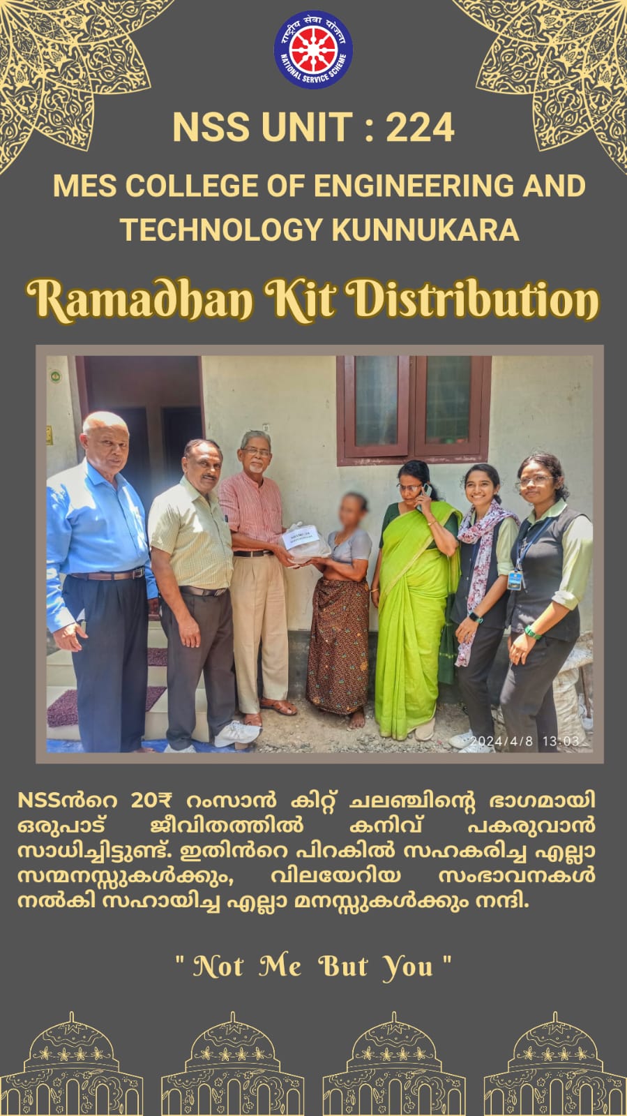 The Motto of NSS “Not Me But You”, reflects the essence of democratic living and upholds the need for self-less service. The philosophy of the NSS is well reflected in this motto, which underlines on the belief that the welfare of an individual is ultimately dependent on the welfare of the society on the whole and therefore, the NSS volunteers shall strive for the well-being of the society. The overall aim of NSS is the Personality Development of students through community service. It gives an extension dimension to Higher Education system and orients the student youth to community service.
